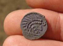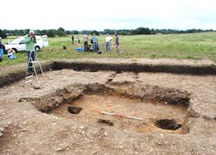 Over the river the geophysical results provided by Dr David Bescoby proved to be spot on, with an Anglo- Saxon “Sunken Feature Building” revealed and fully excavated. Such buildings were essentially timber houses, survived by a large cellar-pit and opposing postholes. This particular building appears to have been fairly short-lived, with the timbers having been removed and the cellar rapidly infilled with soil, scavenged Roman brick/tile and a large volume of butchered animal bone. Saxon small finds included two coins (sceattas) indicating a Middle Saxon date for occupation along with part of a bone comb, hone stone and several fragments of a single hand-made Saxon vessel.